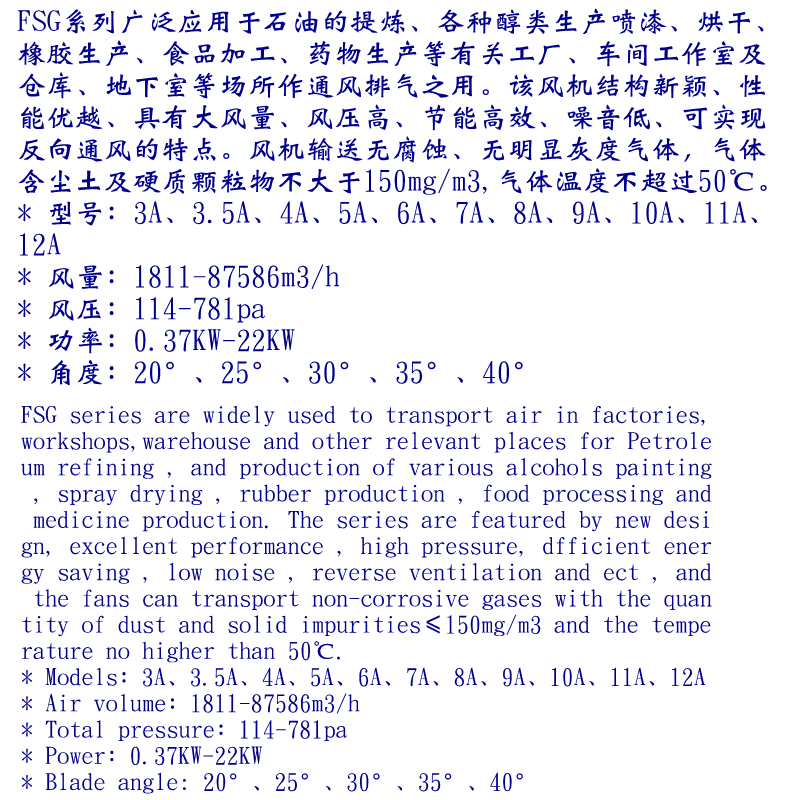 FSG系列廣泛應用于石油的提煉、各種醇類生產噴漆、烘干、橡膠生產、食品加工、藥物生產等有關工廠、車間工作室及倉庫、地下室等場所作通風排氣之用。該風機結構新穎、性能優越、